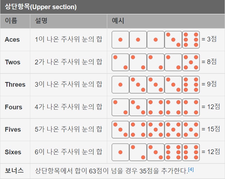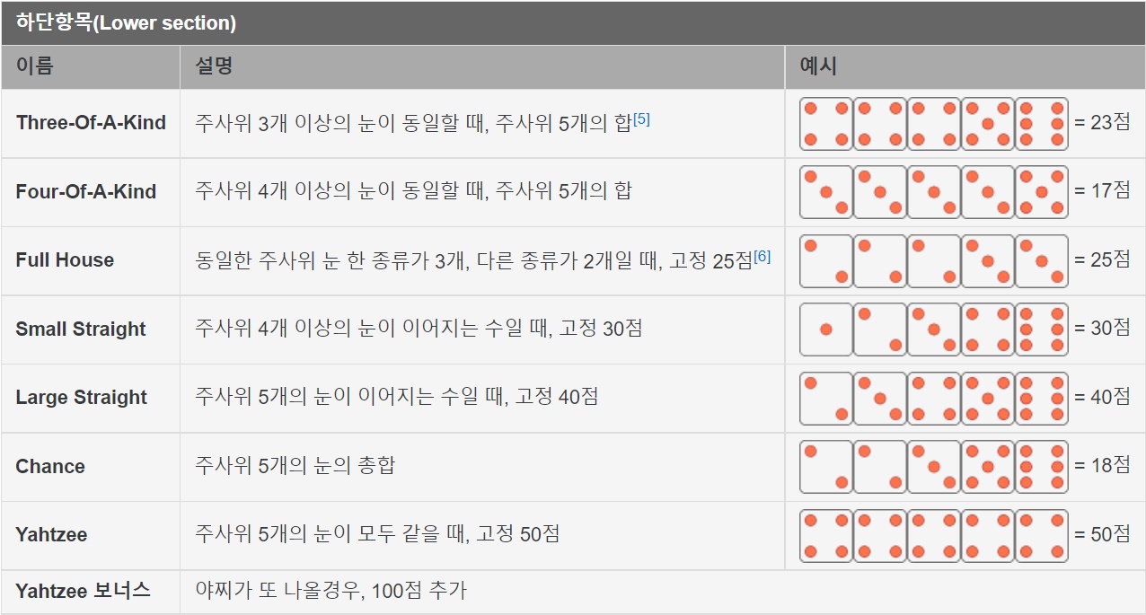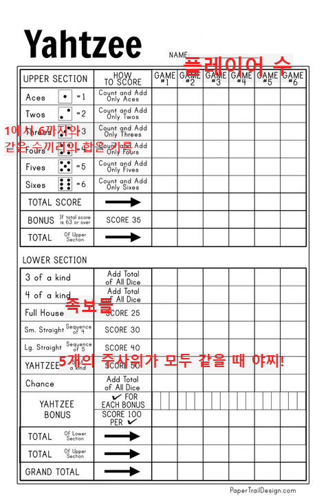 조금 복잡해 보이지만 한 번 게임을 해본다면 금방 익숙해진다 위 점수표의 총 라운드가 13번이므로 한 라운드가 지날수록 쉬워만 질 것이다. 기록이 가능한 점수표가 주어지기 때문에 외울 필요없이 그저 표를 보고 맞춰 점수를 넣으면 된다 곧 주사위로 포커처럼 족보를 만드는 것이기에 원하는 점수를 3회안에 주사위를 던져 기록할 수 있으면 된다.