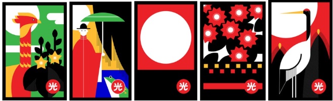 광은 패에 빛 광(光)자 표기 되어 있으며 48장의 화투 중에 5장만 존재한다 광 점수는 다음과도 같다.