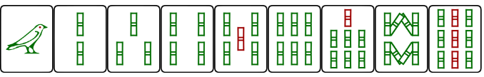 - 삭수패 / 만 타일 (Bamboo): 1부터 9까지의 대나무 그림이 그려진 타일로, 총 4세트가 있습니다.