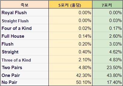 5장으로 게임하는 텍사스홀덤과 7장으로 하는 세븐포커의 족보 순위는 위와 같이 동일할지라도, 족보의 확률은 확연히 달라진다 카드 수의 차이도 오픈되어 공개 되어지는 가능성도 다 다르기 때문이다.